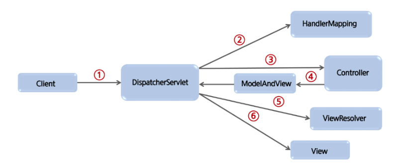 개별 컨트롤러 클래스는 Handler라고 하며, DI를 통해 생성해둔 Bean을 통해 비즈니스 로직 처리 결과를 Model에 담아 다시 프론트 컨트롤러로 보낸다. 프론트 컨트롤러는 받은 Model을 알맞은 View 템플릿으로 전달하여 반영시키고, 최종적으로 클라이언트로 보낼 화면을 응답 결과로 전송한다.