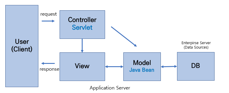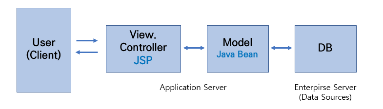 MVC1 패턴이란, 사용자로부터 요청이 들어오면 DB로부터 필요한 데이터를 받은 Model 객체를 JSP 페이지(View)에 담아 응답으로 보내는 패턴