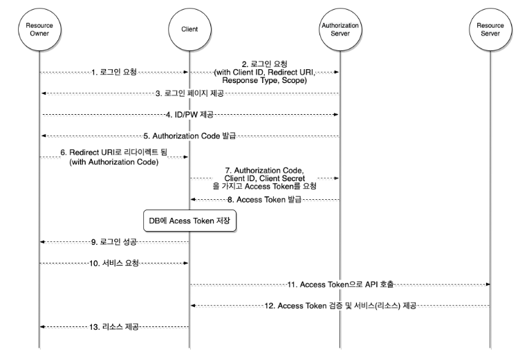 Client는 자신이 발급받은 Resource Owner의 Access Token을 데이터베이스에 저장하고, 이후 Resource Server에서 Resource Owner의 리소스에 접근하기 위해 Access Token을 사용합니다
