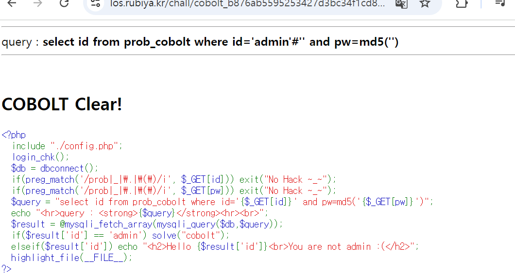 $query = "select id from prob_cobolt where id='{$_GET[id]}' and pw=md5('{$_GET[pw]}')";