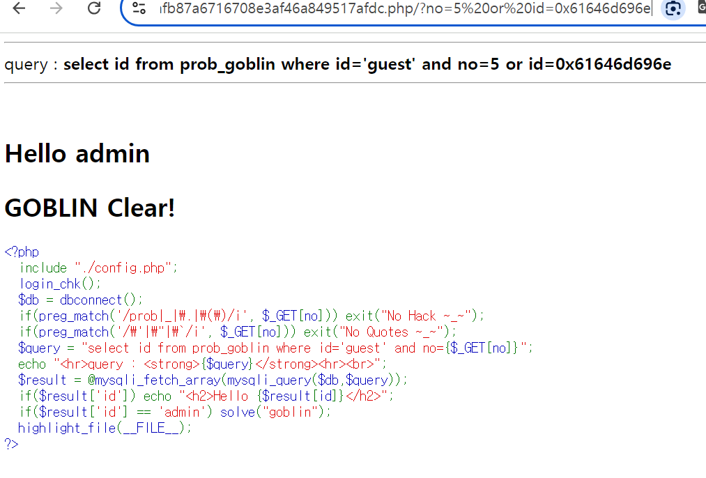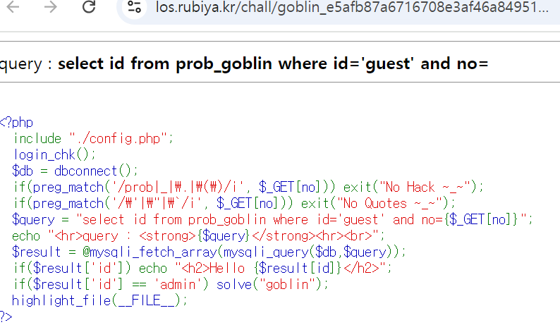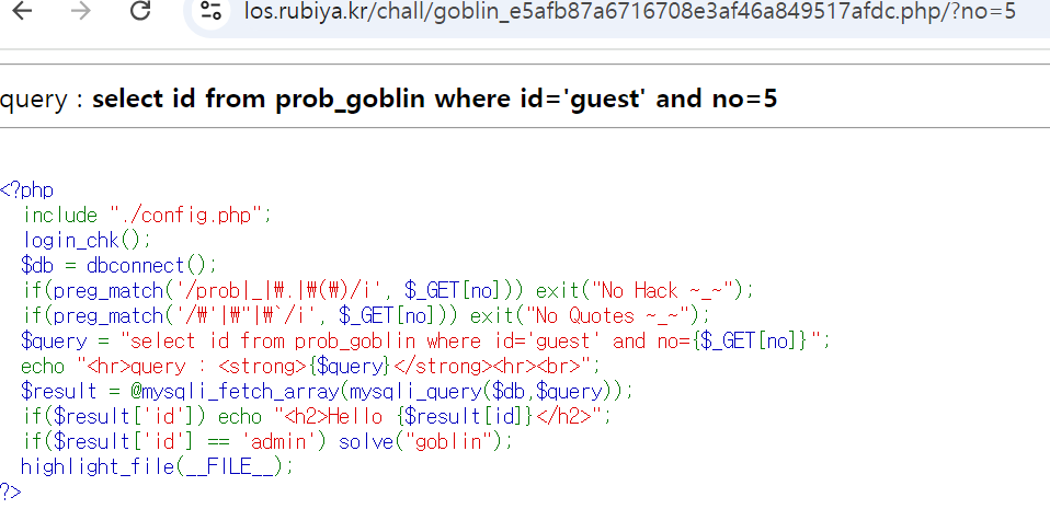 $query = "select id from prob_goblin where id='guest' and no={$_GET[no]}";