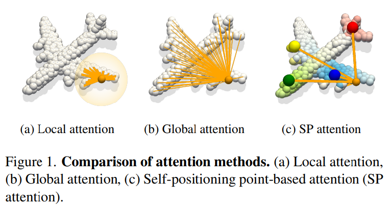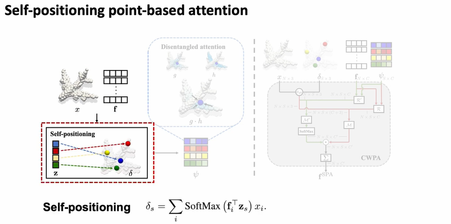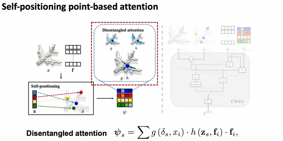 - We propose a global cross-attention mechanism with flexible self-positioning points (SPA). SPA aggregates information on a few self-positioning points via disentangled attention and non-locally distributes information to semantically related points