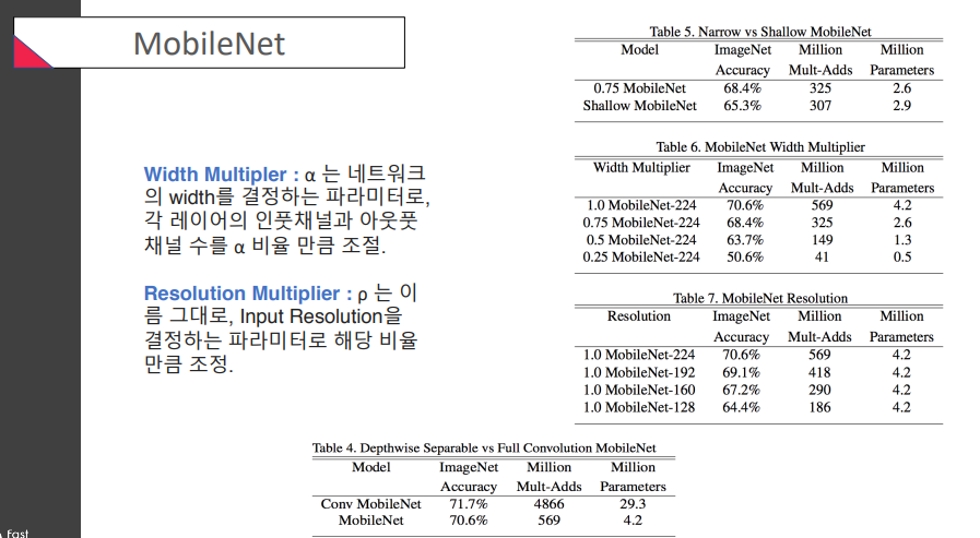 Width Multiplier : width 조정Resolution Multiplier: input resolution 조정위 결과들을 보면, narrow일수록 / width가 클수록 / resolution이 클수록 -> 결과(accuracy)가 좋은 것을 확인할 수 있었다는거
