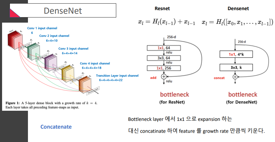 DensNet은 concatinate한다는거! (옆으로 계속 붙인다는거, 마치 등차수열처럼 ㅎ) (growth rate만큼)DenseNet은 concatination이 있으므로 처음에 축소하는 bottleneck만 있음
