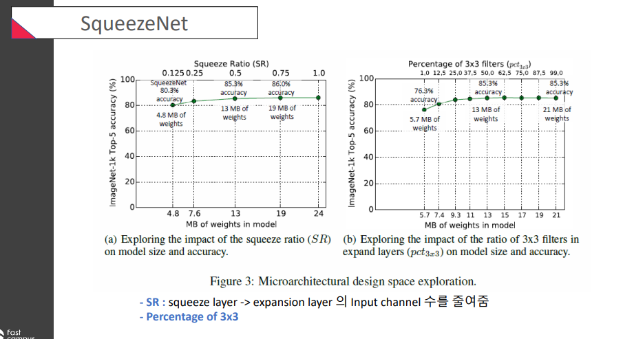 SR(Squeeze Ratio): squeeze layer -> expansion layer의 input channel 수를 줄여줌