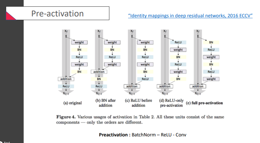 순서가 BatchNorm - ReLU - Conv를 하는 특이한 구조인 full pre-activation을 선택하였음