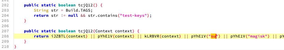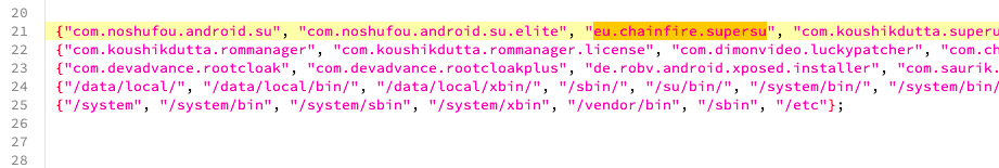 dex 내에는 su 바이너리나, 기타 루팅 여부와 연관된 패키지 등을 탐지하는 코드가 존재합니다.