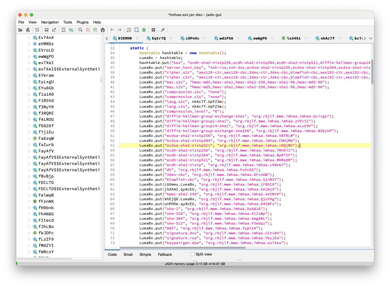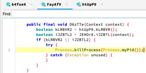 저장된 파일을 살펴보면, KMQYMfhOb 파일은 정상적인 dex 파일입니다. sqlcipher cli에서 알 수 있듯 dex 035로 시작하는 dex 헤더를 가지고 있고, jadx 등을 이용하여 해당 dex를 디컴파일 하는데에도 문제가 없습니다.