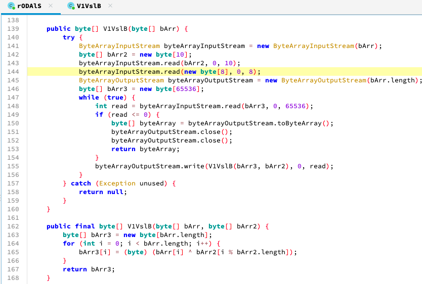 DB 내에서 .jar 파일들을 복호화하는 코드를 보면, 파일의 첫 10바이트를 키로 하고 이후 8바이트를 생략한 이후 65536 바이트 씩 파일을 끊어서, 10 바이트의 키로 복호화하는 점을 알 수 있습니다.