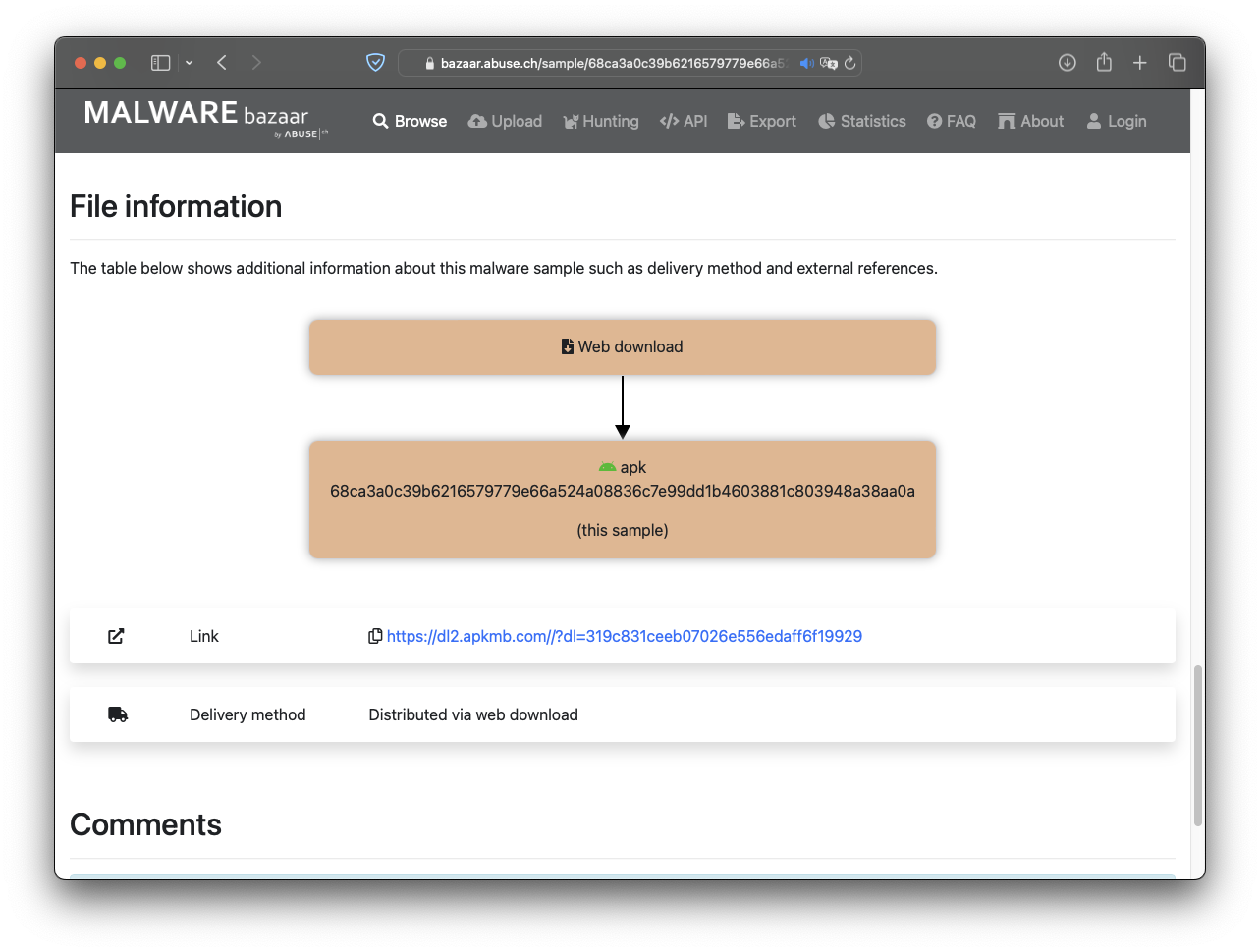 샘플은 Facebook-Mod-457_0_0_54_84.apk라는 파일로, apkmb[.]com이라는 사이트에서 다운로드 된 것으로 나옵니다.