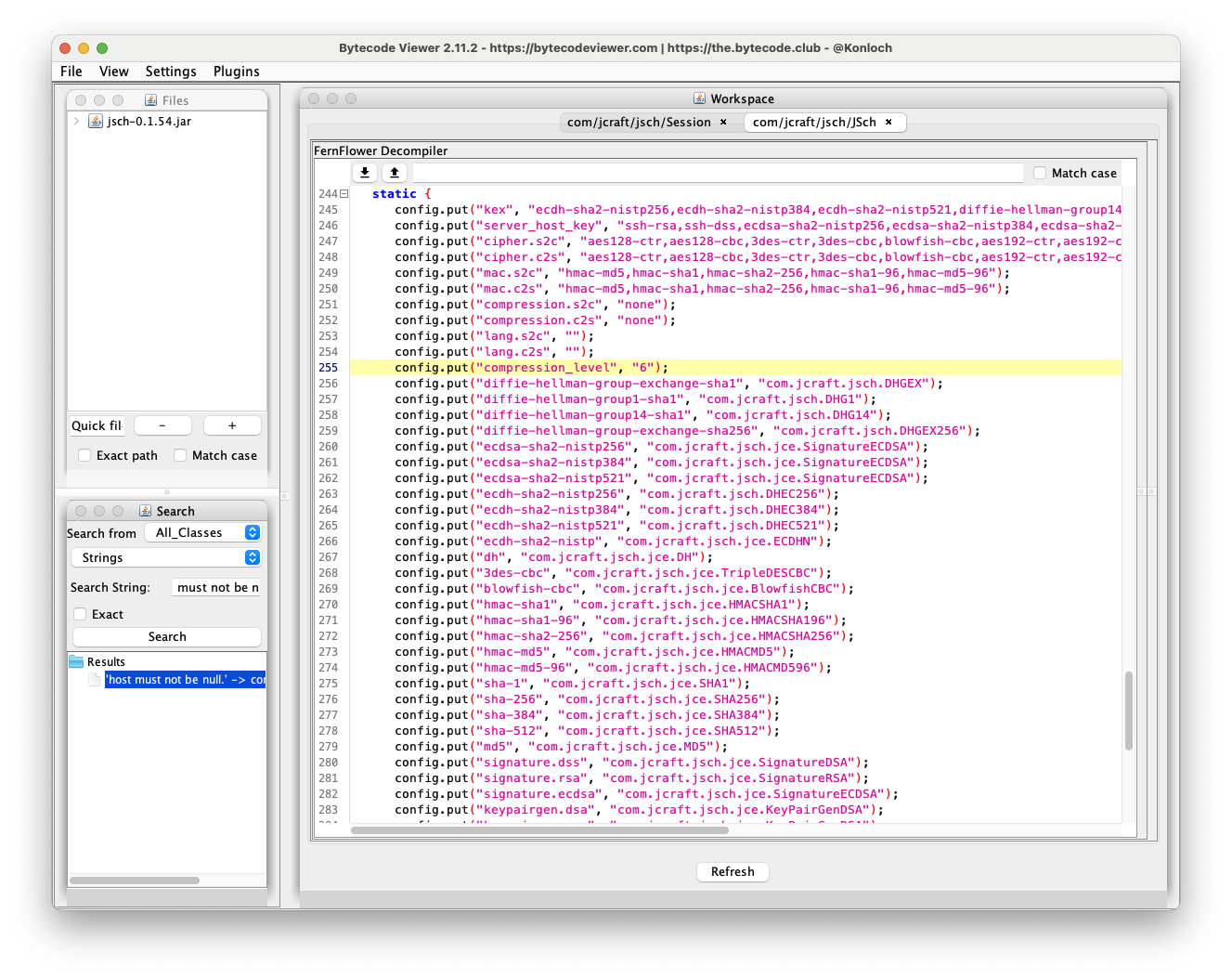 이외에도 샘플은 ssh와 연관된 문자열을 코드 내에 포함하고 있습니다. jsch 프로젝트의 0.1.54 라이브러리와 유사한 코드로 보이며, C2와의 통신이나 기타 통신에 ssh를 활용하고 있지 않는지 의심해볼 수 있습니다.