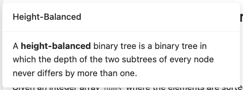 A height-balanced binary tree is a binary tree in which the depth of the two subtrees of every node never differs by more than 1.