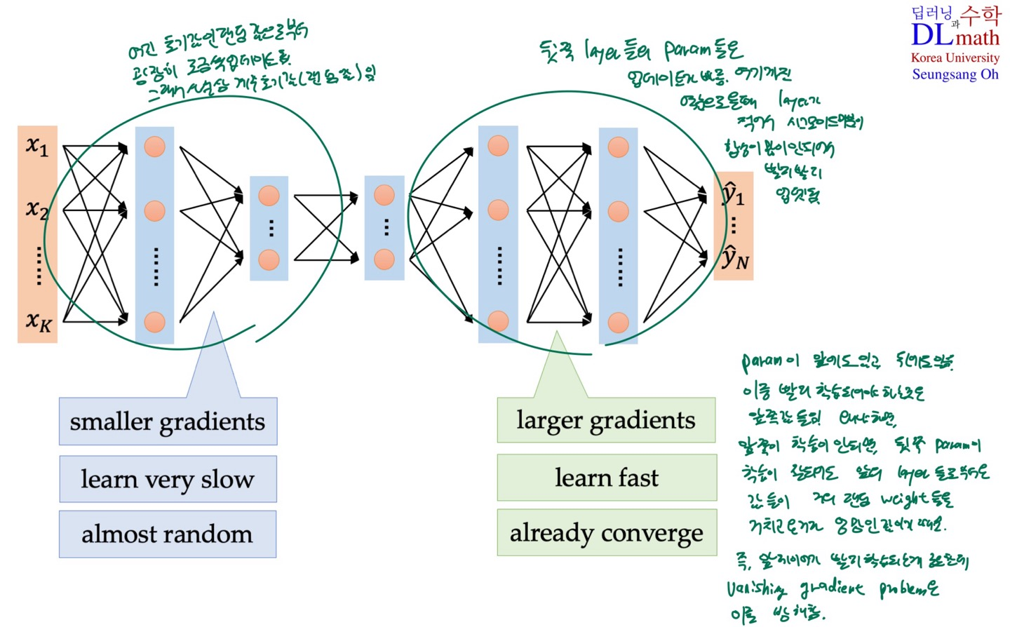 - 이는 파라미터의 학습을 느리게 하며, 특히 output에 가까운 파라미터들의 학습정도에 비해 input에 가까운 파라미터들의 학습정도가 지수적으로 늦음. 따라서 오래 여러번 학습해야함.