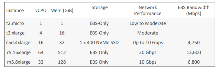 이 표는 주요 EC2 인스턴스 성능을 비교한 표이다.