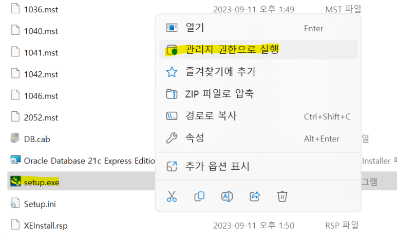 폴더 안에 'setup.exe'를 '관리자 권한으로 실행' 해줍니다.