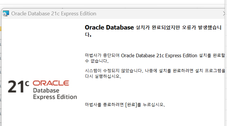 만약 위와 같은 'Oracle Database 설치가 완료되었지만 오류가 발생했습니다.' 화면이 나온다면 아래의 항목들을 확인해보세요.