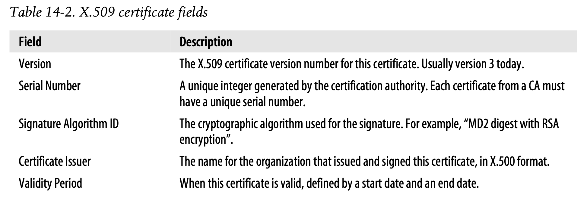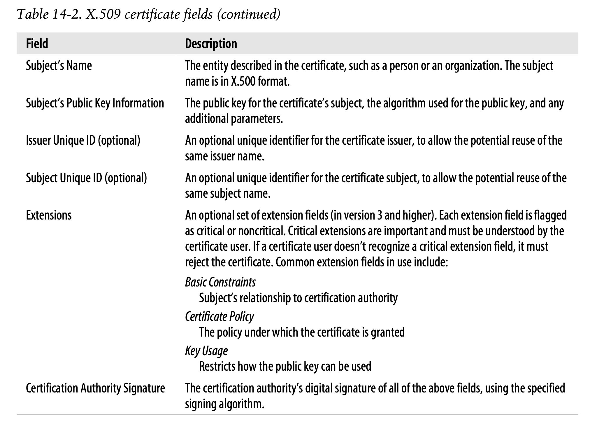 X.509 인증서의 필드는 Table 14-2에 나타난 것과 같습니다.