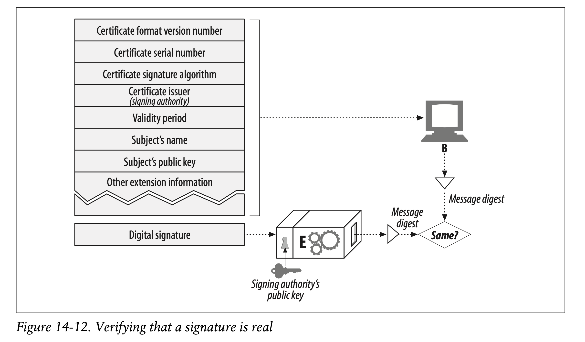 When the browser receives the certificate, it checks the signing authority.* If it is a public, well-respected signing authority, the browser will already know its public key (browsers ship with certificates of many signing authorities preinstalled), so it can verify the signature as we discussed in the previous section, “Digital Signatures.” Figure 14-12 shows how a certificate’s integrity is verified using its digital signature.