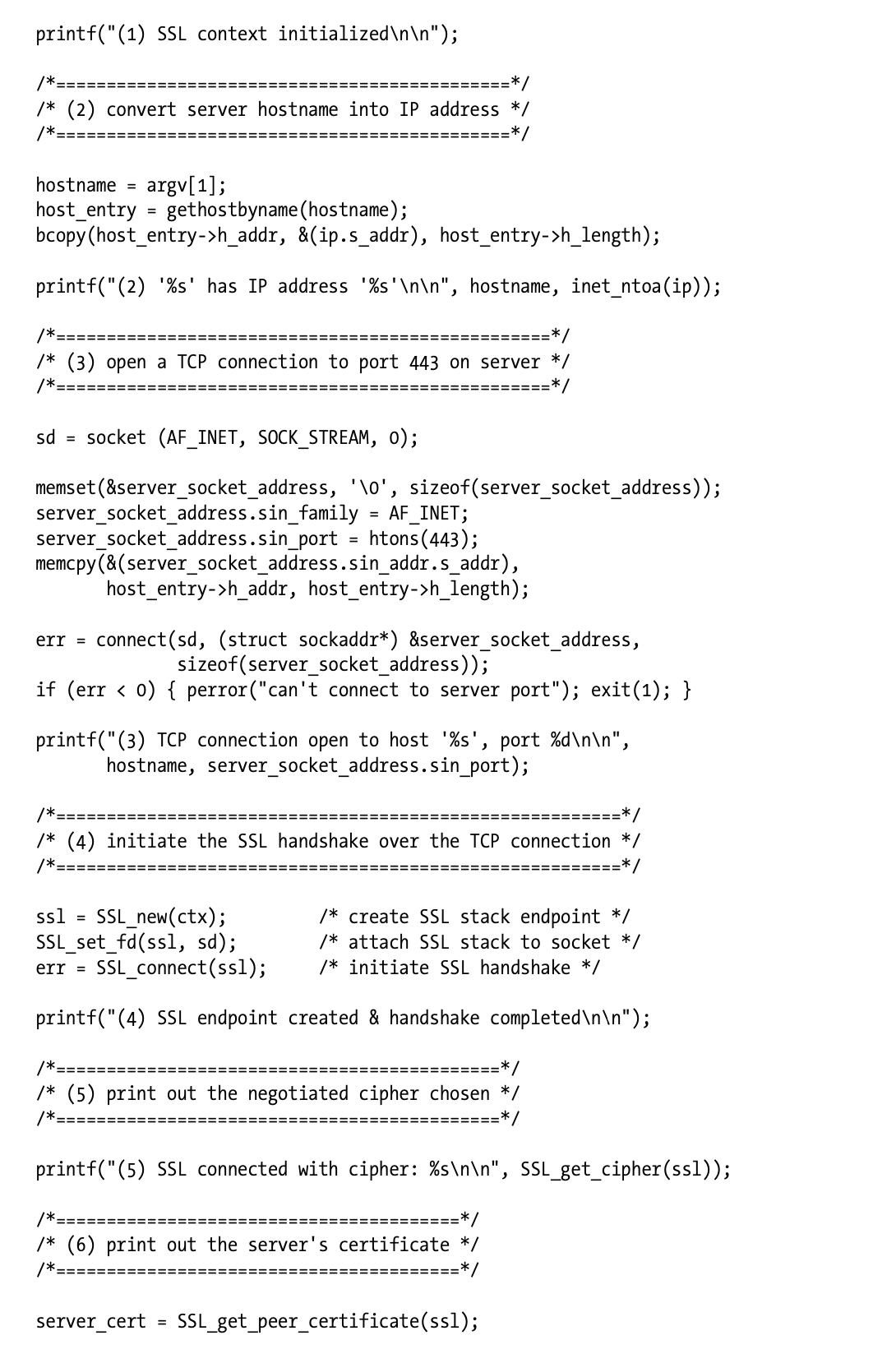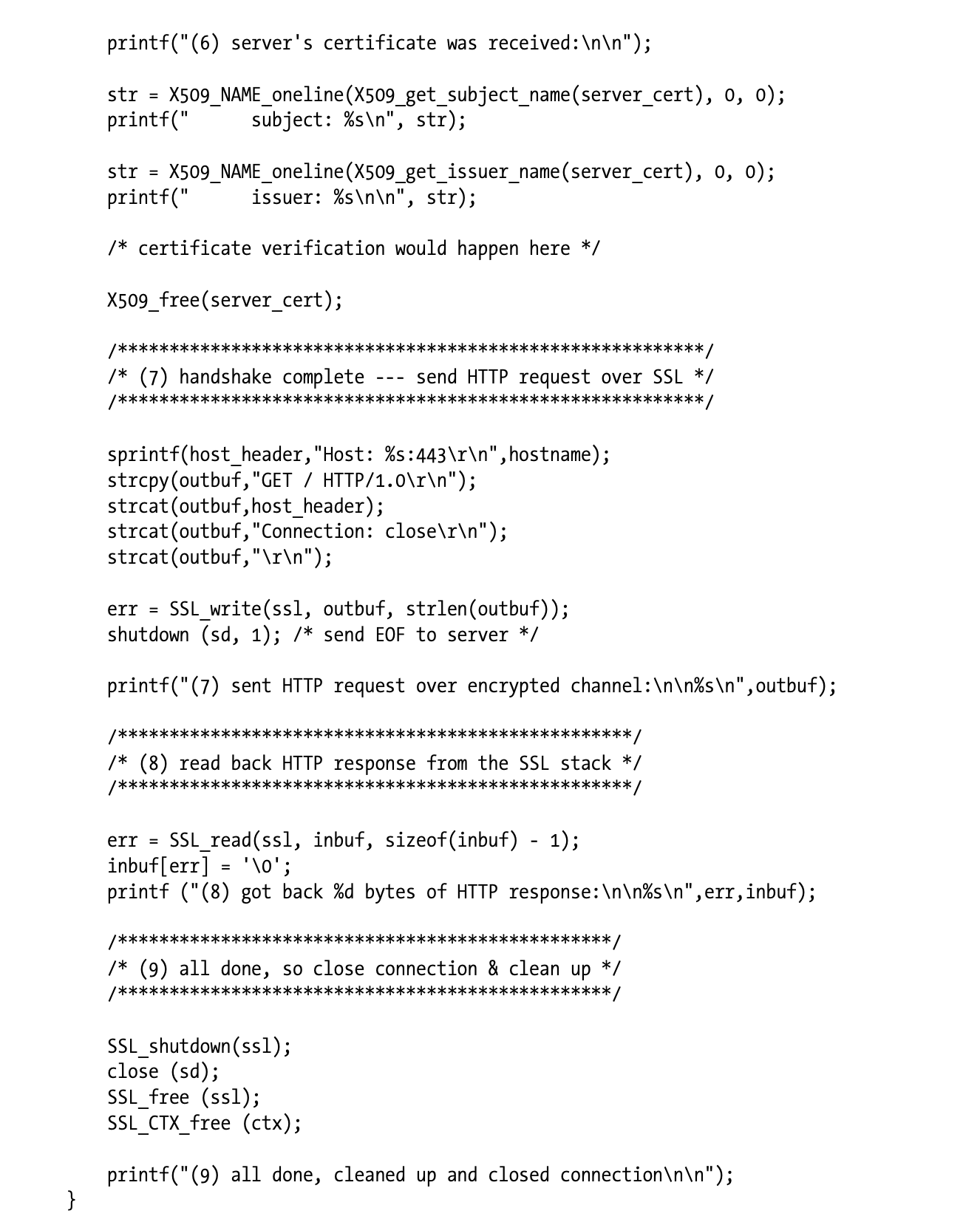 In this section, we’ll use the OpenSSL package to write an extremely primitive HTTPS client. This client establishes an SSL connection with a server, prints out some identification information from the site server, sends an HTTP GET request across the secure channel, receives an HTTP response, and prints the response.