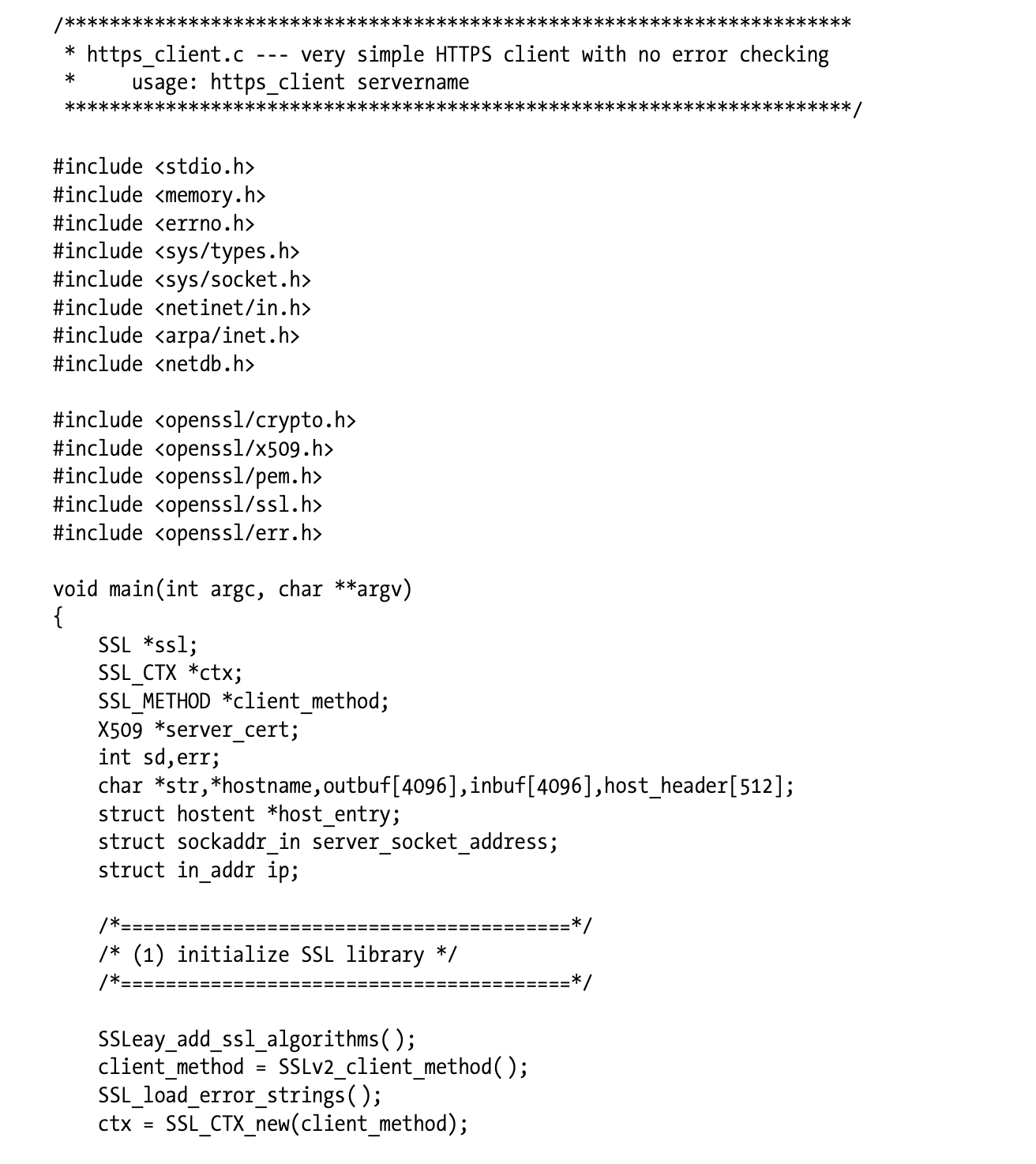 The C program shown below is an OpenSSL implementation of the trivial HTTPS client. To keep the program simple, error-handling and certificate-processing logic has not been included.