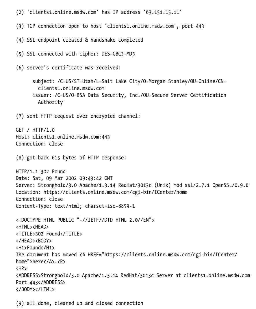 In this example, the client and server negotiated the DES-CBC3-MD5 bulk-encryption cipher. You also can see that the server site certificate belongs to the organization “Morgan Stanley” in “Salt Lake City, Utah, USA”. The certificate was granted by RSA Data Security, and the hostname is “clients1.online.msdw.com,” which matches our request.