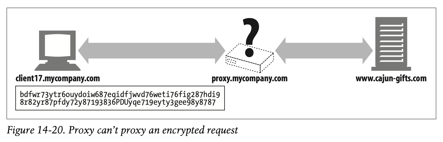 But once the client starts encrypting the data to the server, using the server’s public key, the proxy no longer has the ability to read the HTTP header! And if the proxy cannot read the HTTP header, it won’t know where to forward the request (Figure 14-20).