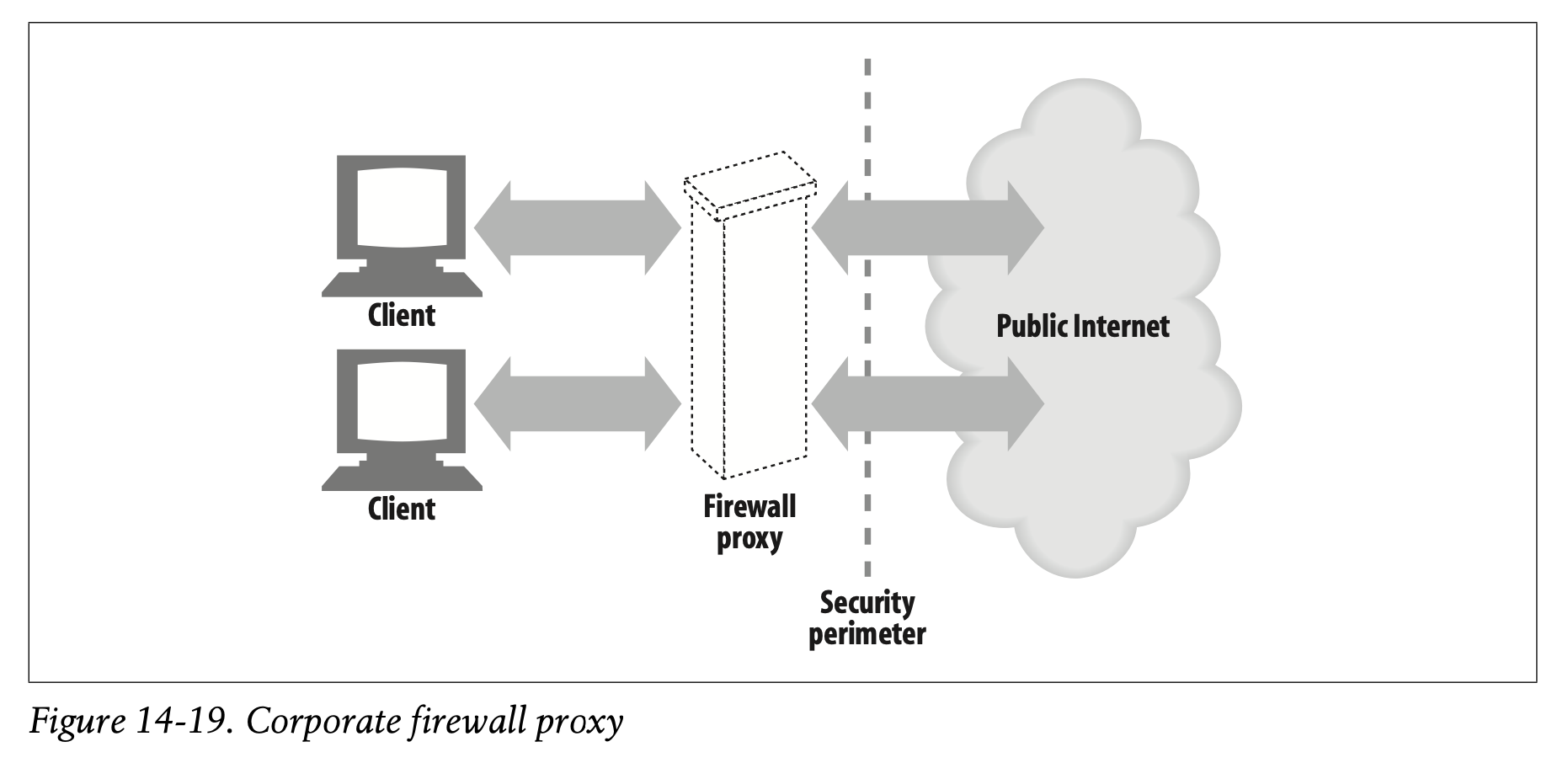 많은 기업들이 기업 네트워크와 공공 인터넷을 나누는 보안 경계에 프록시를 위치시킵니다. (Figure 14-19)