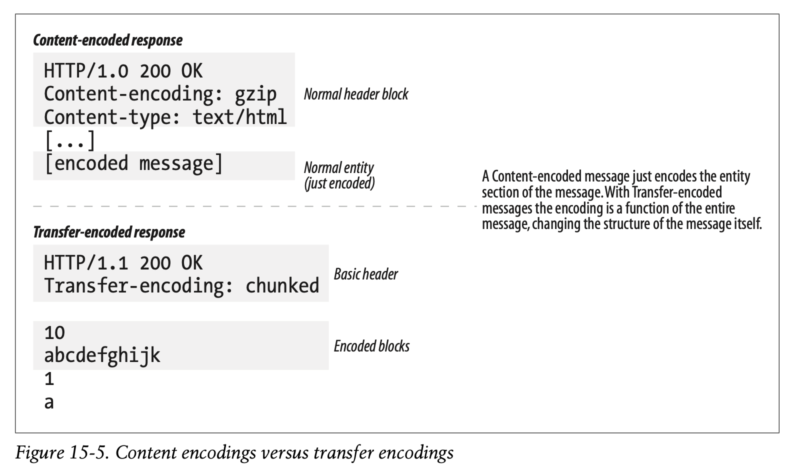 The previous section discussed content encodings—reversible transformations applied to the body of the message. Content encodings are tightly associated with the details of the particular content format. For example, you might compress a text file with gzip, but not a JPEG file, because JPEGs don’t compress well with gzip.