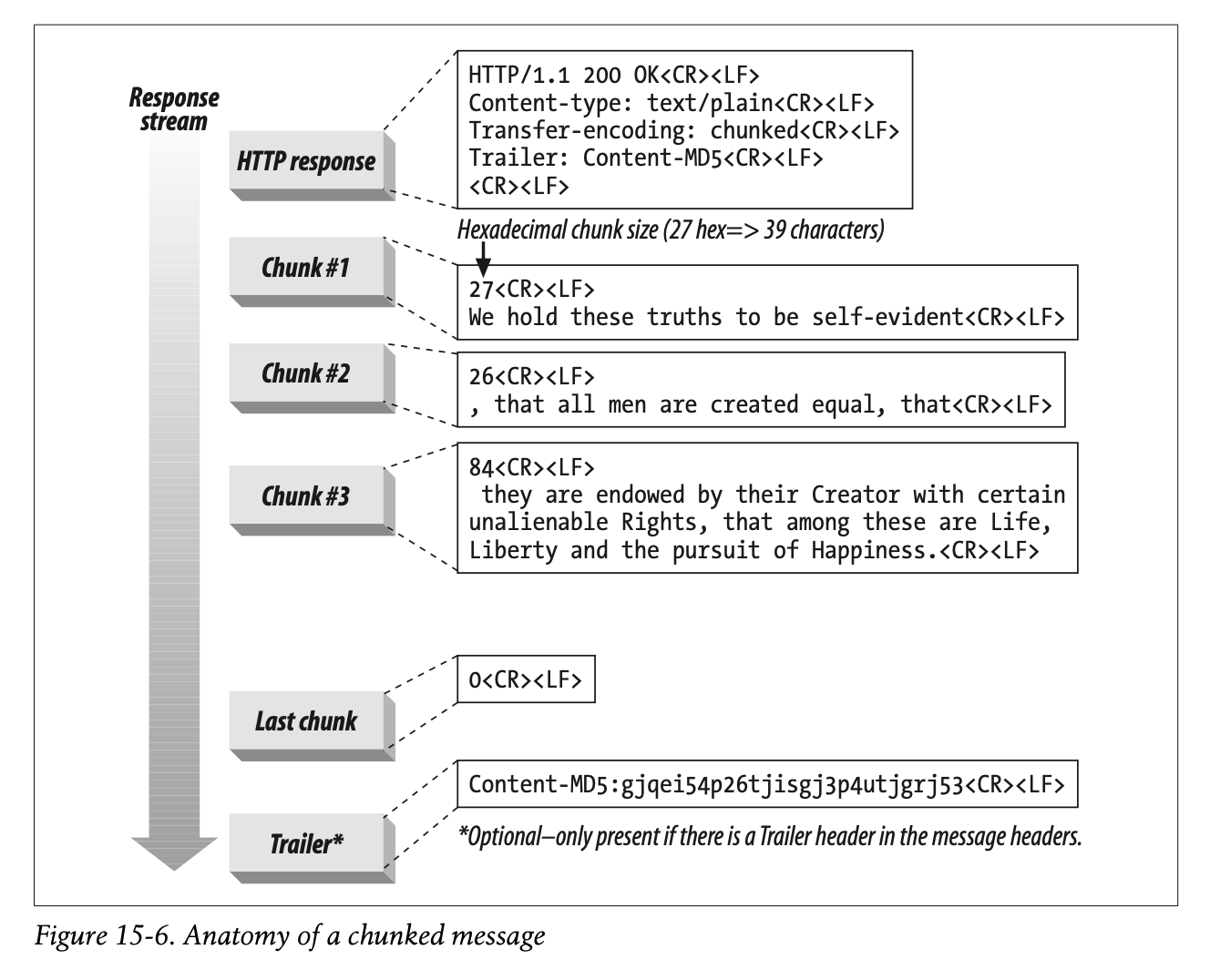 Chunked encoding is fairly simple. Figure 15-6 shows the basic anatomy of a chunked message. It begins with an initial HTTP response header block, followed by a stream of chunks. Each chunk contains a length value and the data for that chunk. The length value is in hexadecimal form and is separated from the chunk data with a CRLF. The size of the chunk data is measured in bytes and includes neither the CRLF sequence between the length value and the data nor the CRLF sequence at the end of the chunk. The last chunk is special—it has a length of zero, which signifies “end of body.”