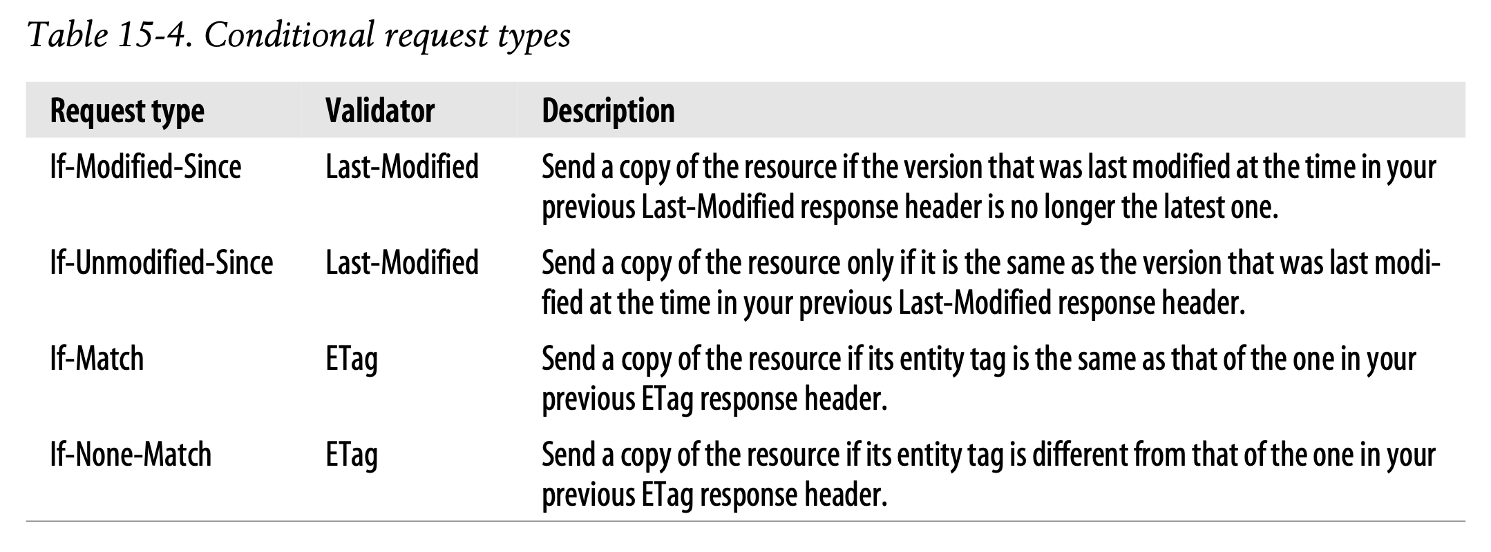 Table 15-4는 조건부 요청에 사용되는 4가지 HTTP 헤더를 나열하고 있습니다.