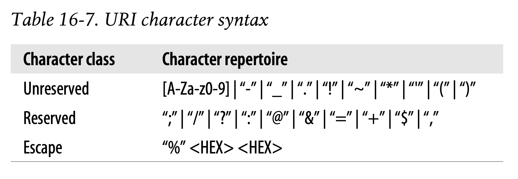 - Unreserved : 임의의 URI 컴포넌트에서 사용 가능한 문자