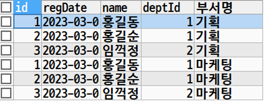 SELECT emp.*, dept.name AS `부서명` FROM emp INNER JOIN dept;
