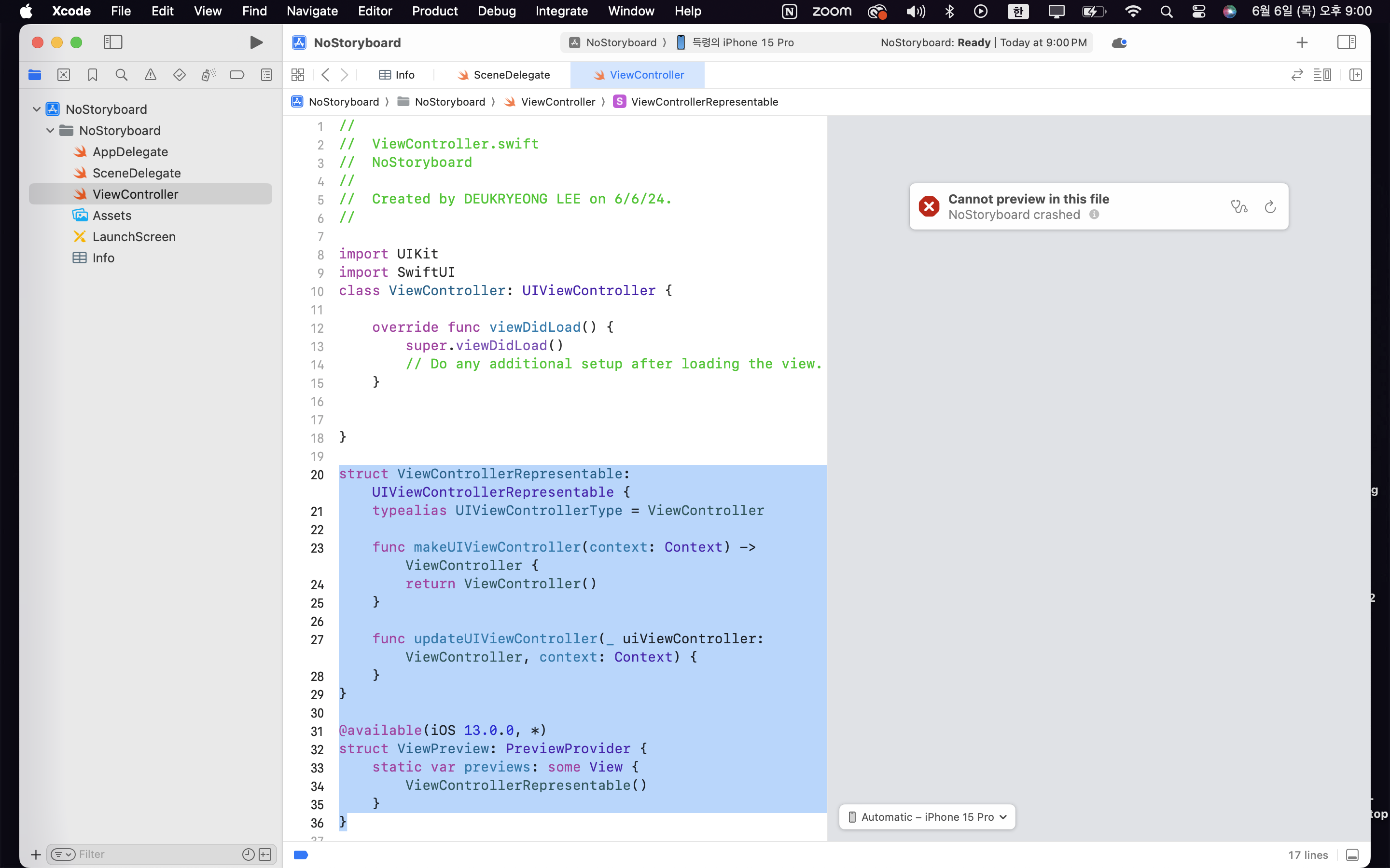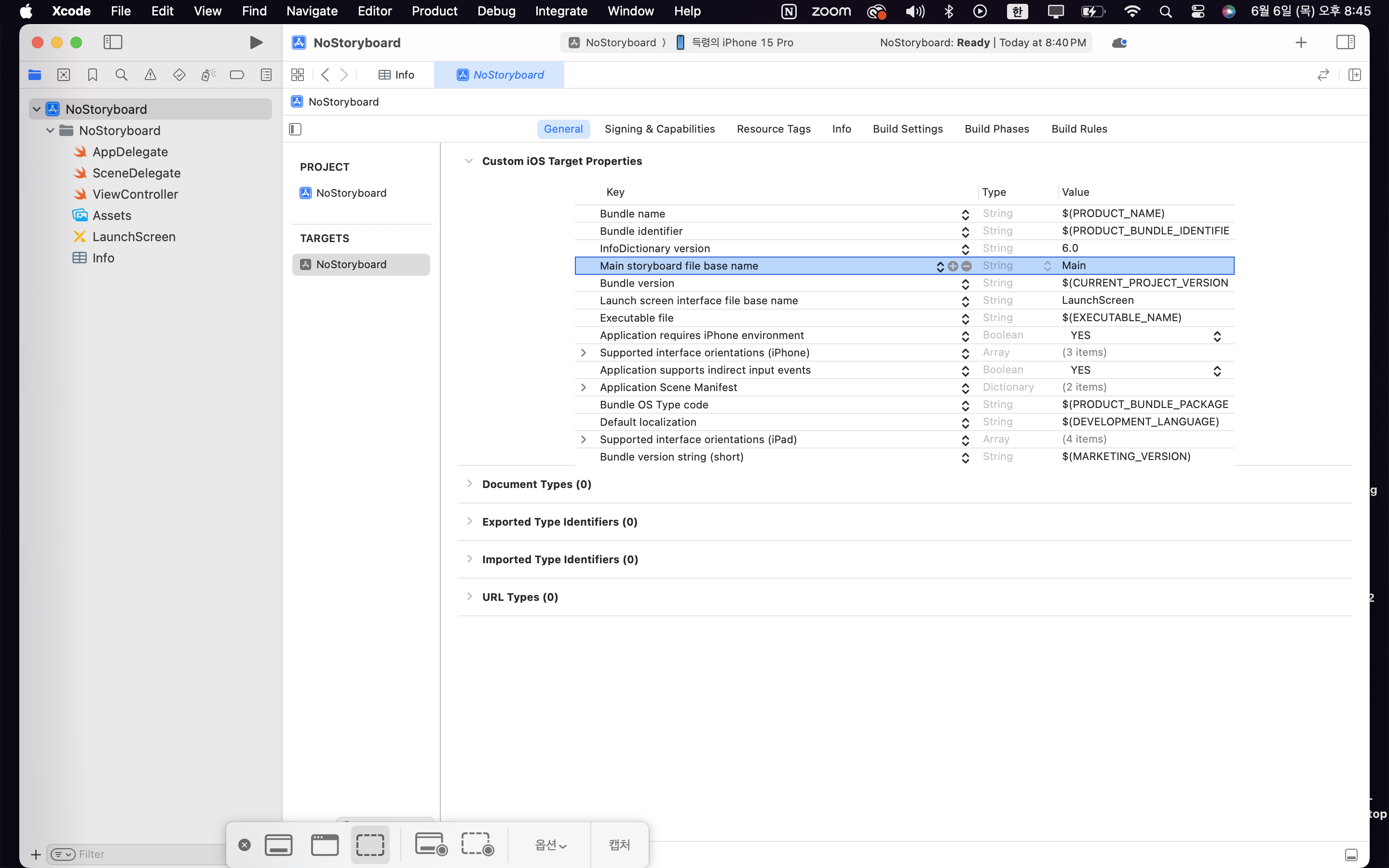 Info → Application Scene Manifest → Scene Configuration → Window Application Session Role → Item 0 → Storyboard Name 경로로 오셔서 Storyboard Name을 삭제해주세요