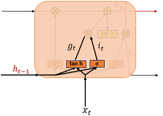 - 시그모이드 함수를 지나 과 1 사이의 값 it와 하이퍼볼릭탄젠트 함수를 지나 -1과 1사이의 값을 가지는gt를 이용해 기억할 정보의 양을 정함