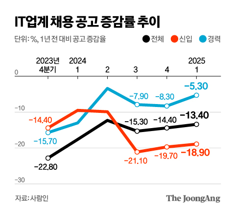 2025년 1분기 기준으로 신입 개발자 구인 공고는 작년 대비 18.9% 감소했다.