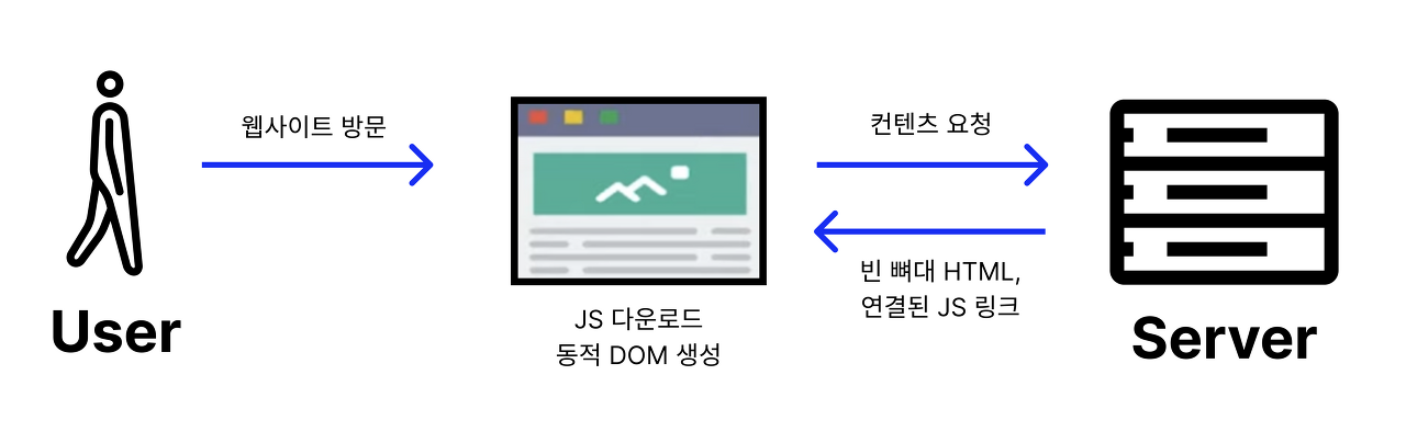 HTML κ³Ό λ€μ΄λ‘λν μ μλ JavaScript λ§ν¬ λ₯Ό μλ΅(Response)νλ€.HTML μ JSλ₯Ό μ μ©νκΈ°μν΄ μλ΅λ°μ JavaScript λ§ν¬ λ₯Ό ν΅ν΄ μλ²λ‘λΆν° JS νμΌμ λ°μμ¨λ€.HTML μ λ°μμ¨ JS νμΌμ μ μ©μμΌ λμ νμ΄μ§λ‘ λ§λ€μ΄ λΈλΌμ°μ μ μΆλ ₯νλ€.CSR μ€λͺ