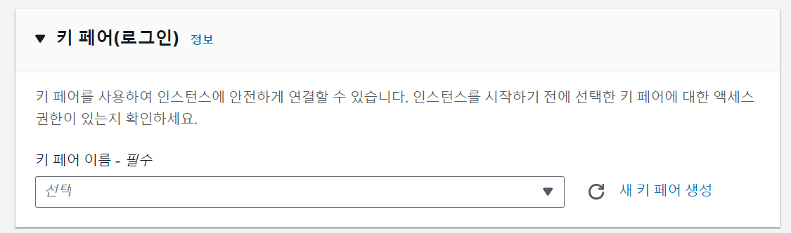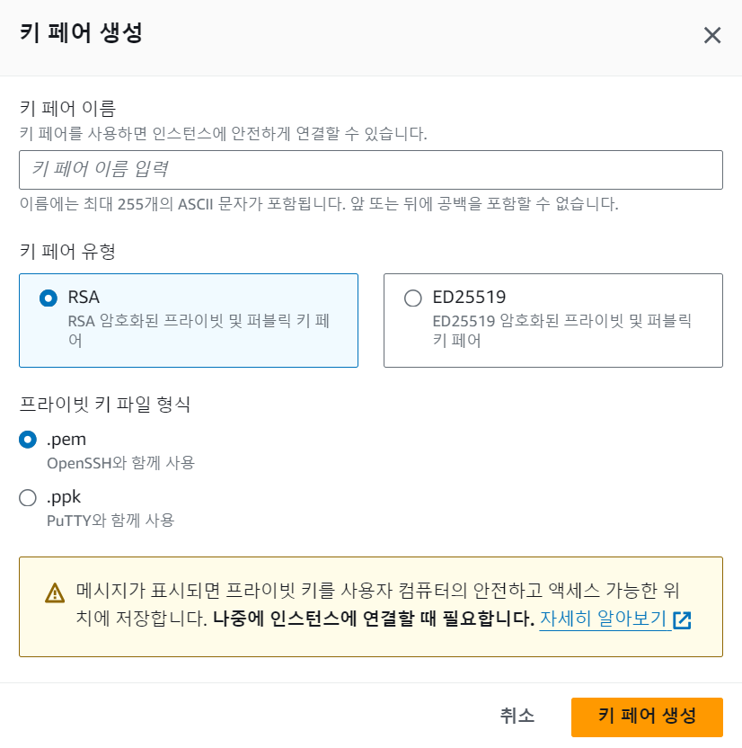 이름을 입력하고 각자 원하는 방식으로 설정하고 키페어 생성 버튼을 선택하면 된다.