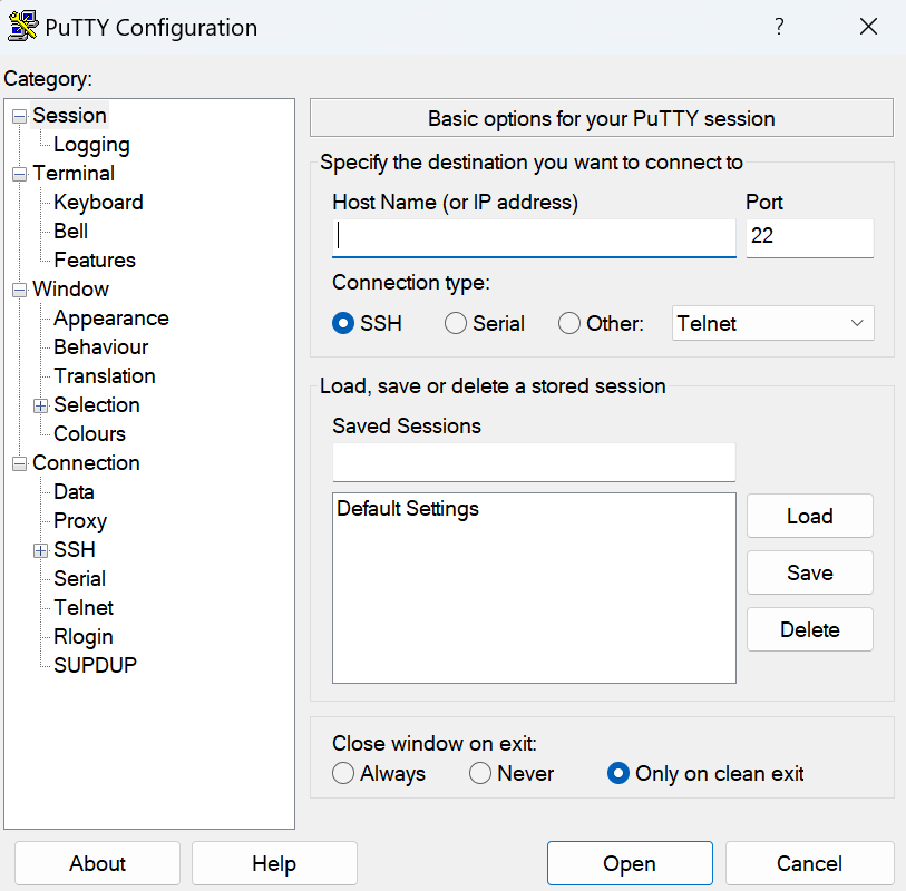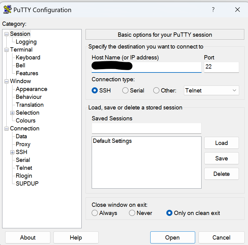 다시 Session으로 돌아가서, 추후 접속을 위해 saved session에 원하는 이름을 넣고, save 버튼을 클릭하고, 해당 session을 다시 클릭하고 open 버튼을 클릭하자.
