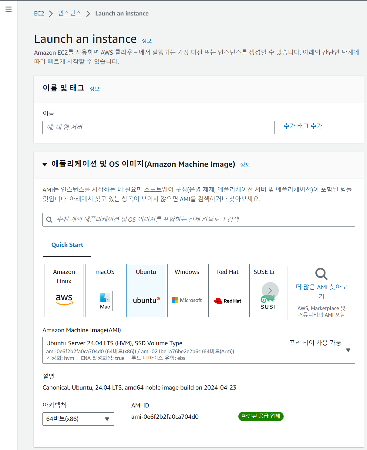 사람마다 다르지만 난 Ubuntu를 이용하기로 했다 우리는 프리티어를 사용할 것이므로 프리티어 사용 가능이 적힌 AMI를 사용하자.