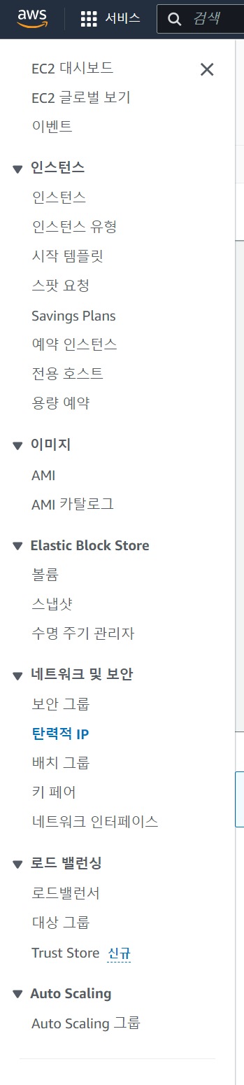 좌측 카테고리의 네트워크 및 보안 -> 탄력적 IP 를 선택.
