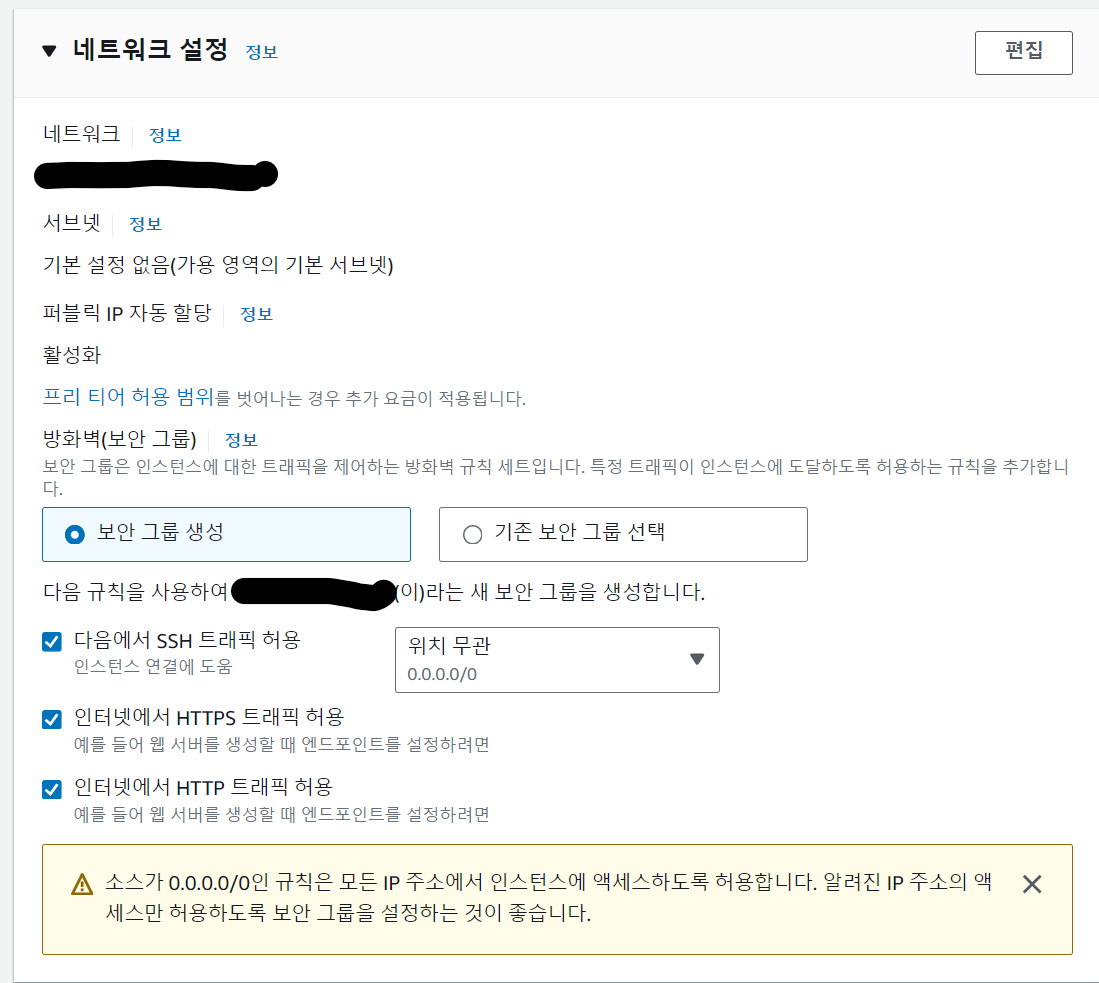 기존에 선택되어있는 다음에서 SSH 트래픽 허용외에도 HTTPS와 HTTP 트래픽 허용 둘 다 선택해주었다.