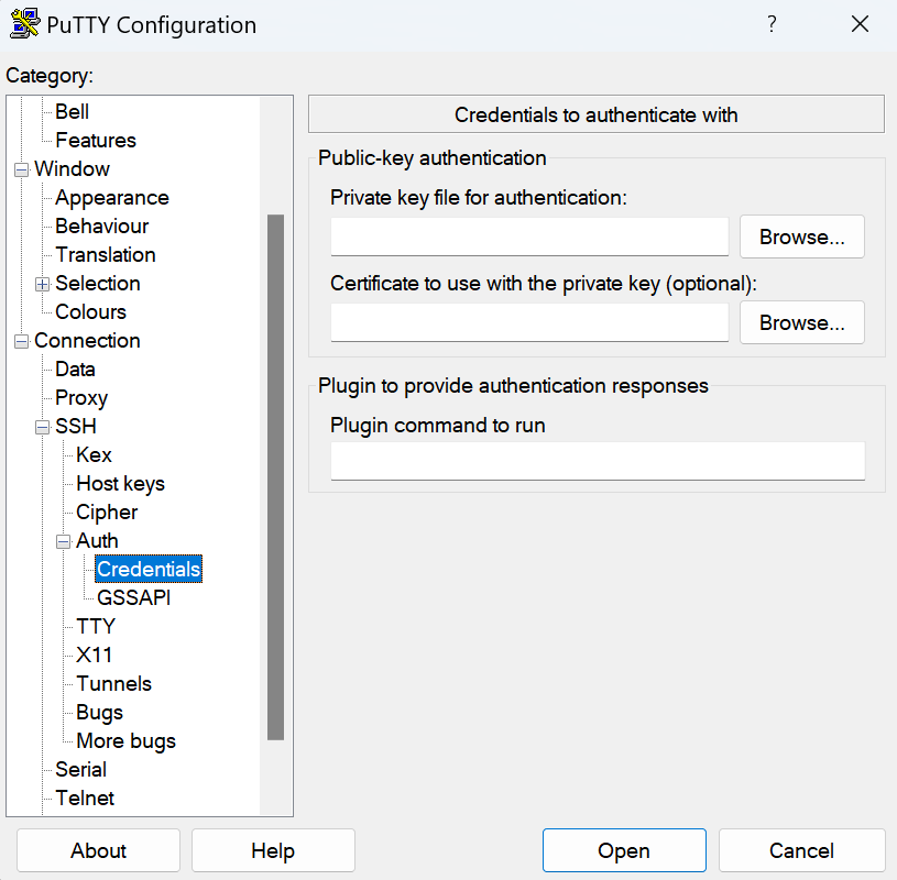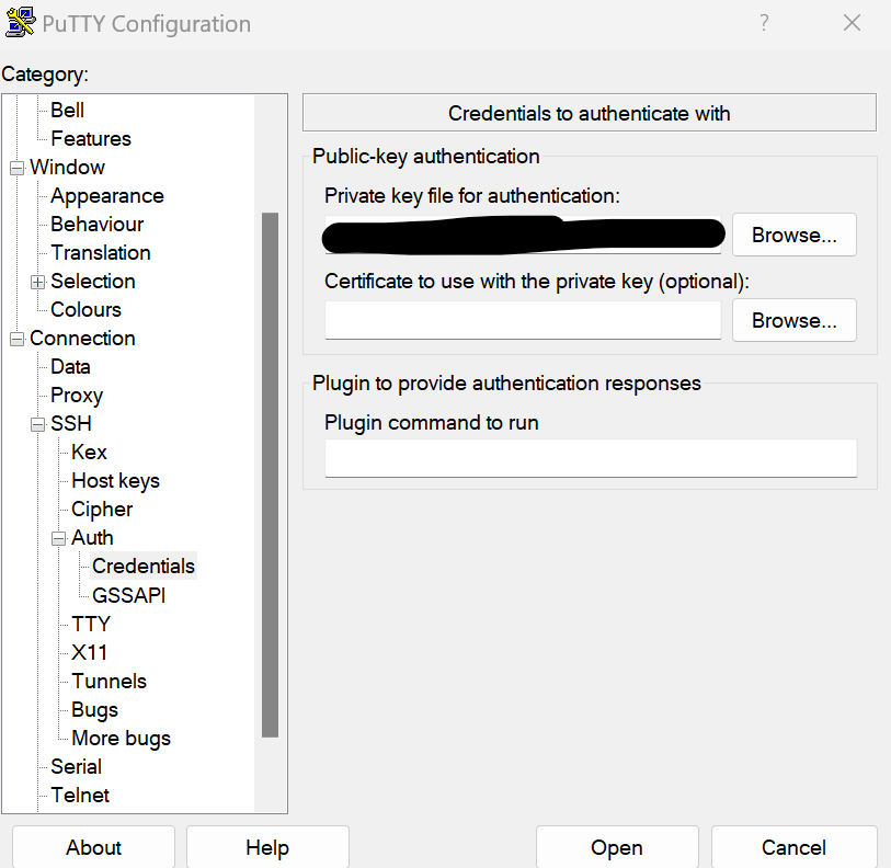 이제 좌측 카테고리에서 Connection -> SSH -> Auth -> Credentials로 들어가자
