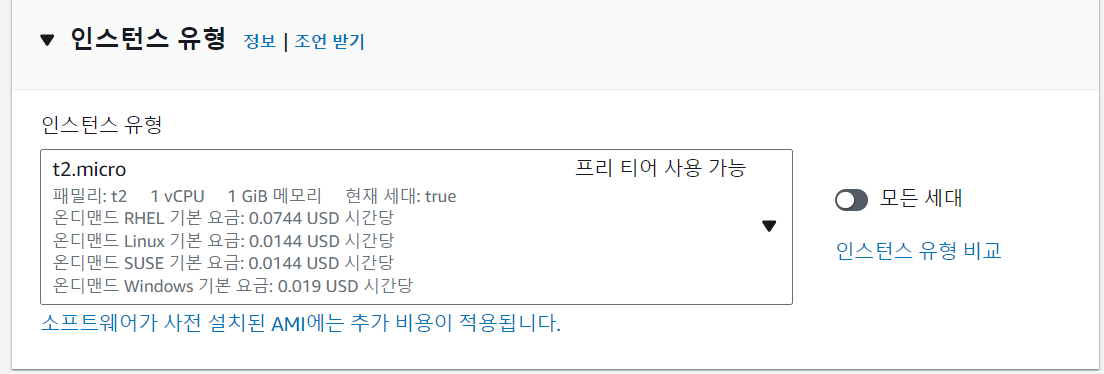 인스턴스 유형도 프리 티어 가능한 t2.micro를 선택하자.