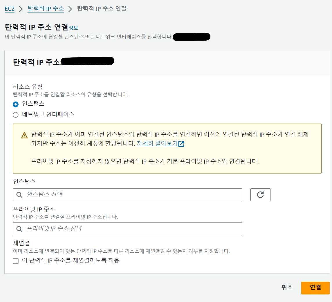 이곳에서 인스턴스와 프라이빗 IP주소를 선택후 연결 버튼을 클릭.
