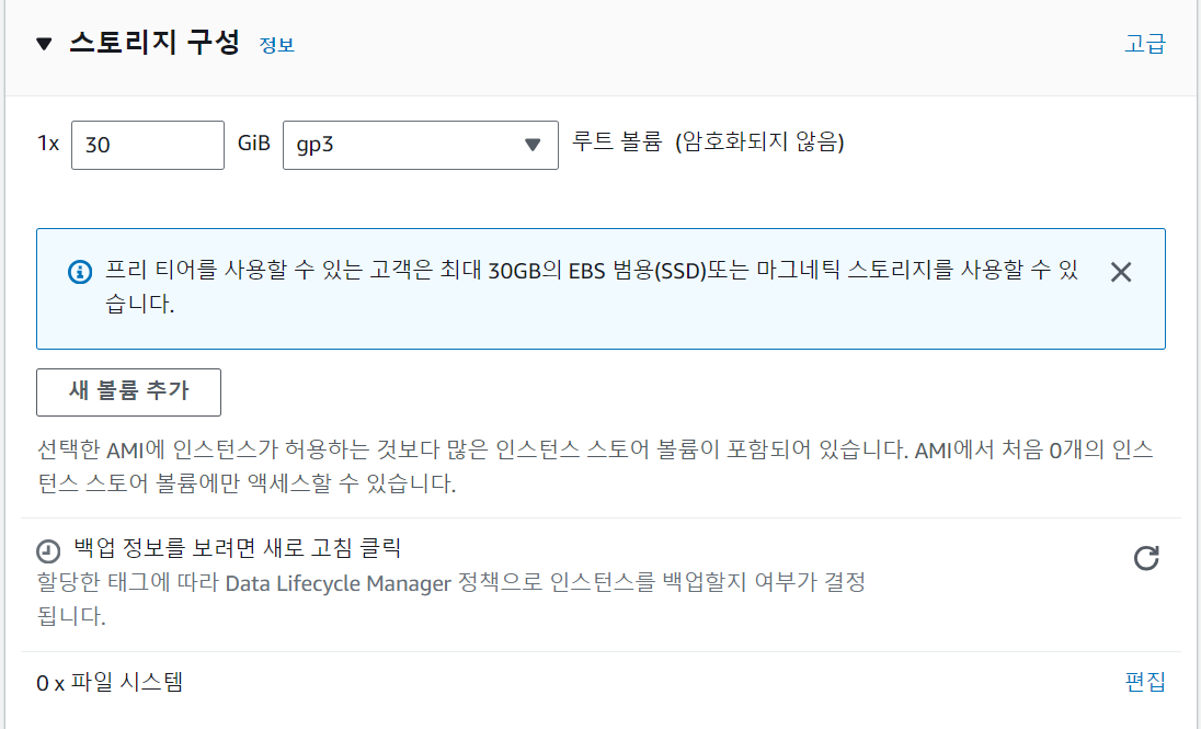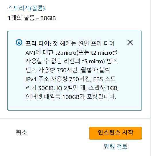 스토리지는 아래에 적혀있듯 최대 30GB를 사용할 수 있다고 하니 30GB 사용할 수 있게 해주자. 반드시 이렇게 할 필요는 없다.