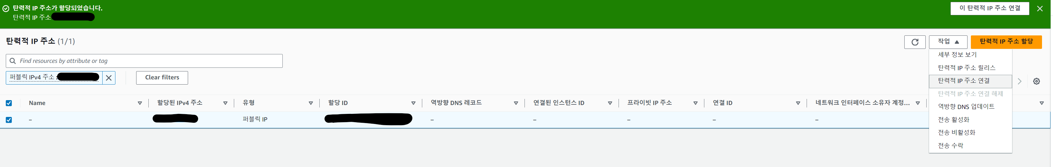 이제 할당된 탄력적 IP 주소를 선택하고 작업 버튼에서 탄력적 IP 주소 연결을 클릭해준다.