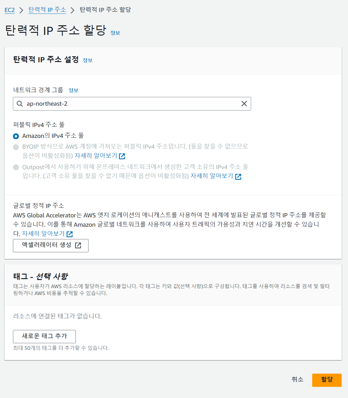 우측 상단의 주황색깔 탄력적 IP 주소 할당 버튼을 클릭