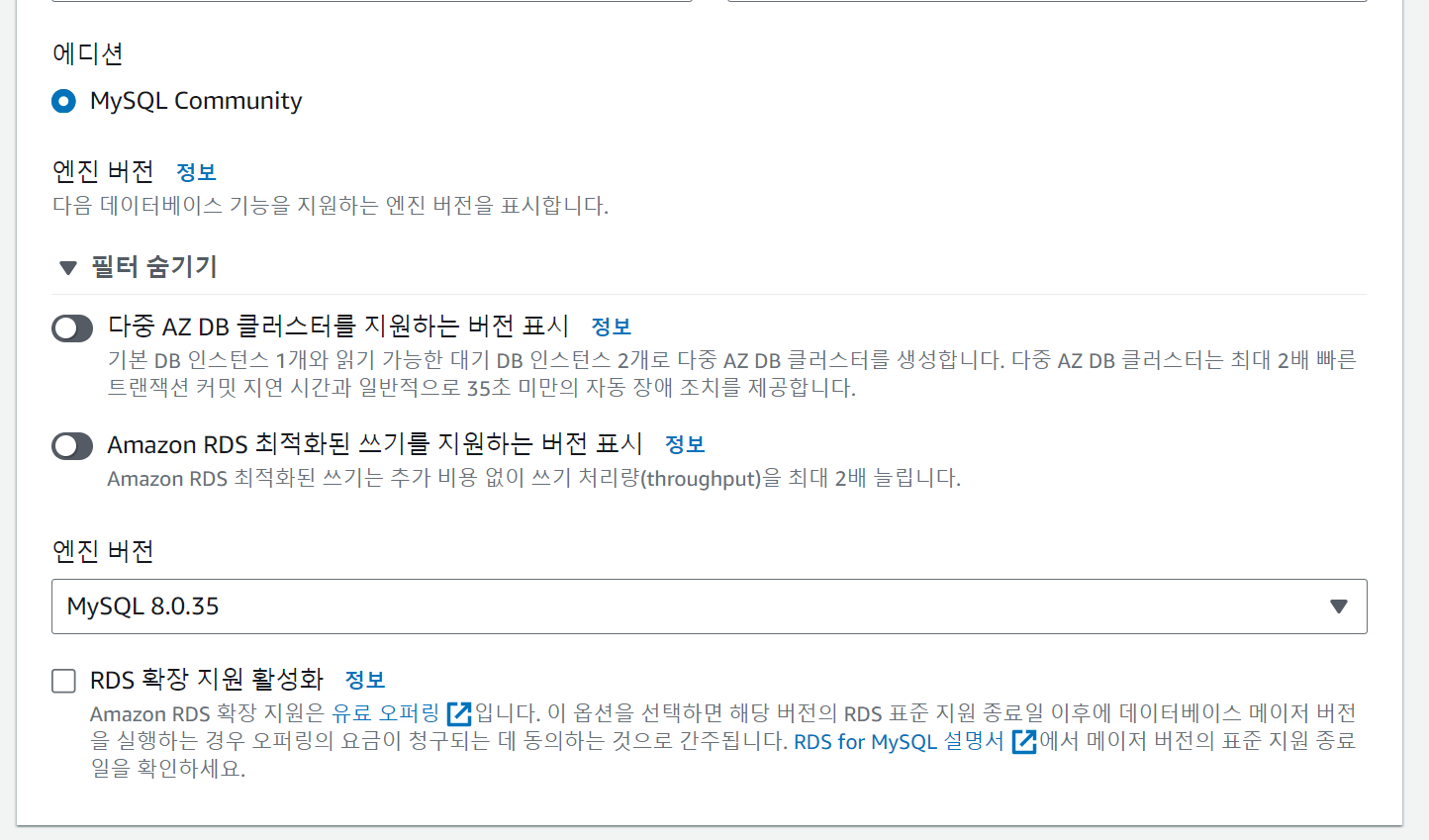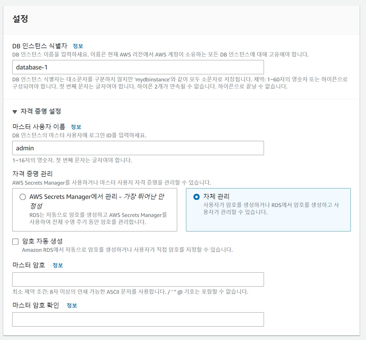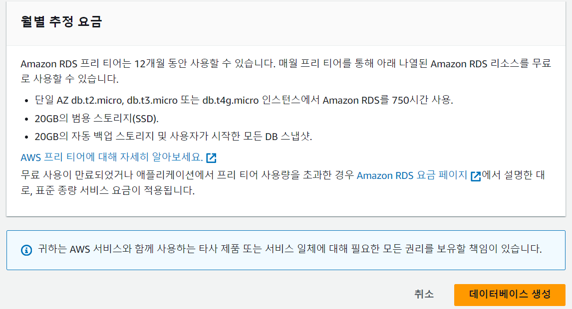 여기서 각자 DB인스턴스 식별자 명과 마스터 사용자 이름, 마스터 암호를 설정하고 기록이든 기억이든 해서 잊지말자.