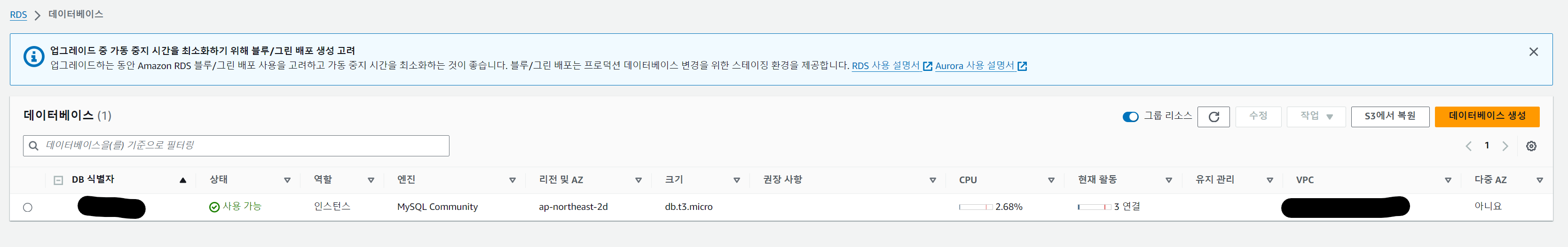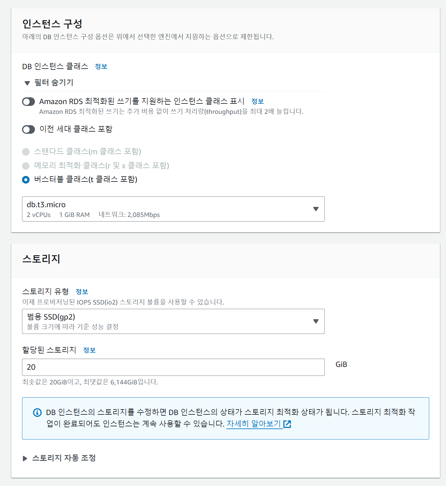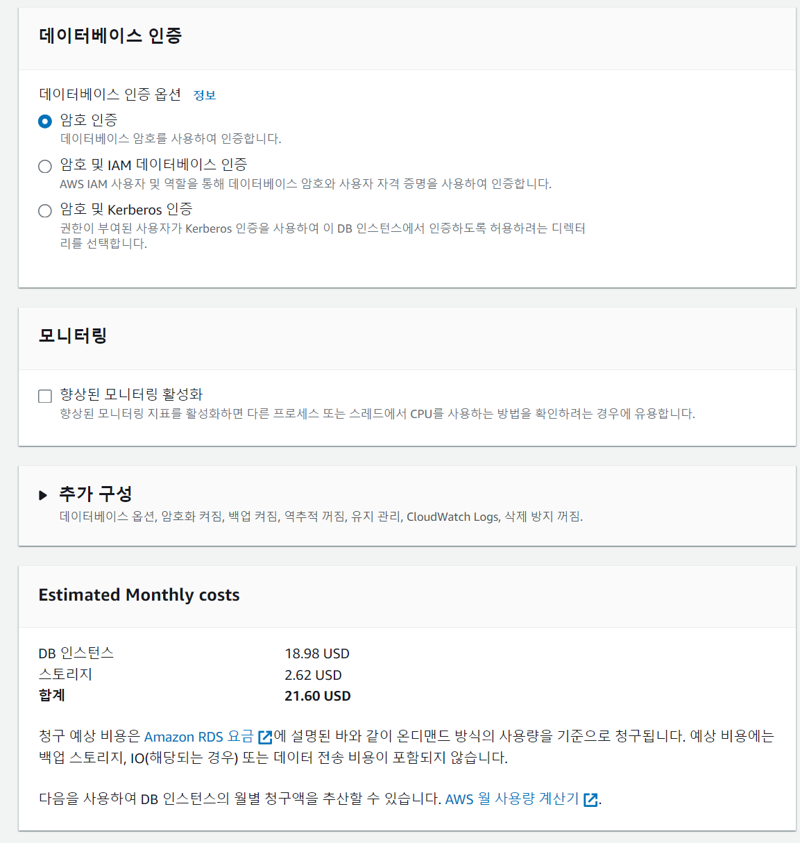 여기서 각자 DB인스턴스 식별자 명과 마스터 사용자 이름, 마스터 암호를 설정하고 기록이든 기억이든 해서 잊지말자.